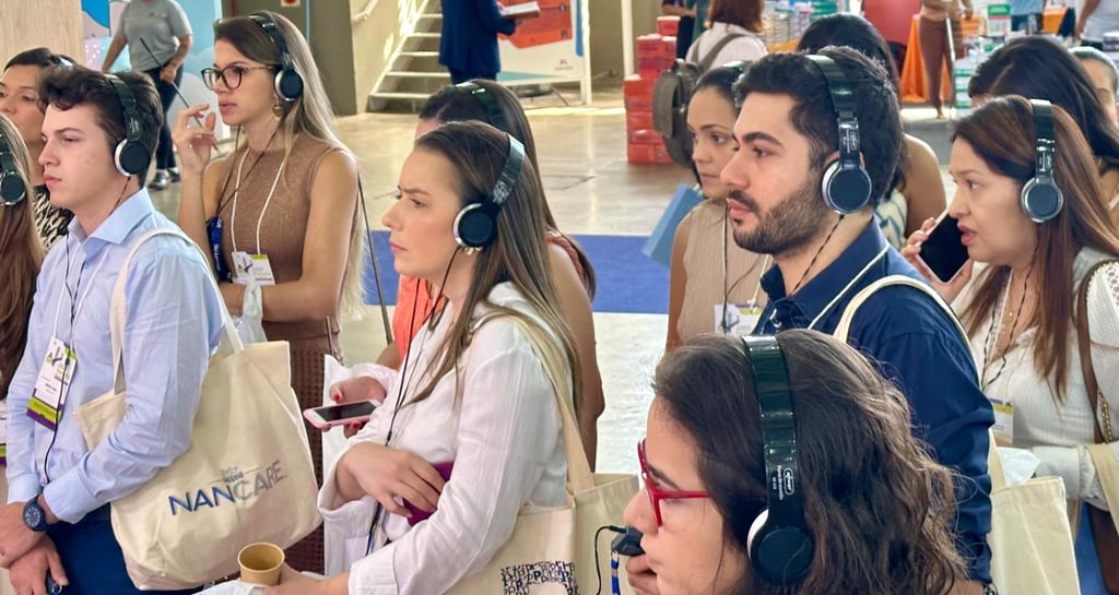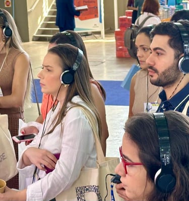 Oferecemos palestras silenciosas com fones wifi de alta qualidade para experiências interativas e envolventes.
